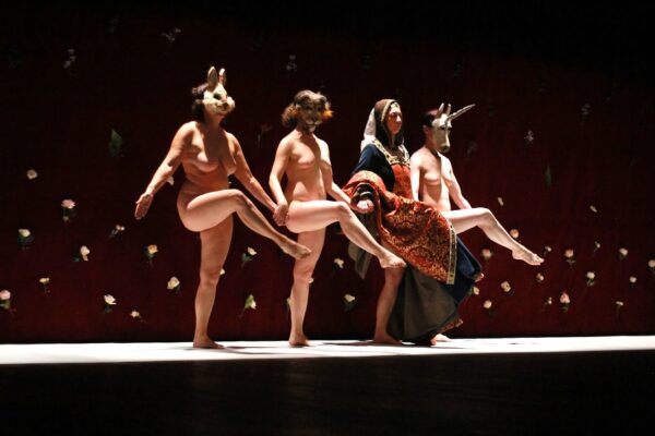 As tapeçarias originais, datadas do século XV, apresentam uma figura feminina idealizada, cercada por animais fantásticos e elementos florais, frequentemente interpretada como um emblema de virtude e castidade. Bourges, no entanto, subverte essa leitura ao despir as intérpretes, expondo a vulnerabilidade e a força do corpo feminino em sua forma mais crua. A encenação, com quatro artistas nuas, explora a dualidade entre a figura idealizada da Dama e os simbolismos contidos no bestiário da tapeçaria, como o leão e o unicórnio. Ao vestir as intérpretes com máscaras de animais como o coelho — tradicionalmente associado à fertilidade e, por vezes, à luxúria — e questionar a virgindade da Dama através da exposição do corpo feminino em diferentes perspectivas e movimentos, Bourges provoca e convida o público a repensar os códigos morais e estéticos que moldam nossa percepção da história da arte e da identidade feminina.