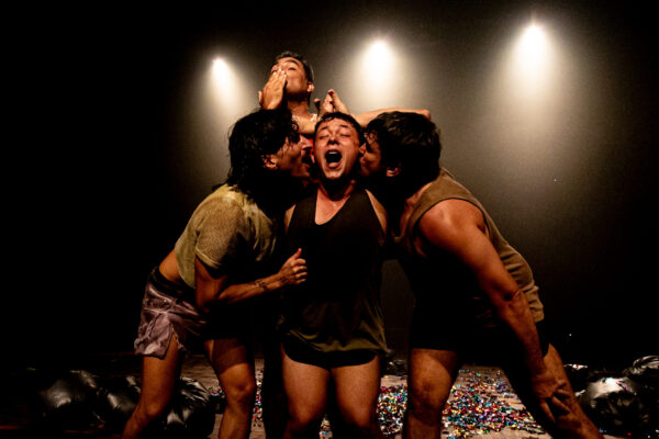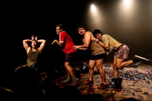 O trabalho corporal desenvolvido pelo elenco (Álvaro Dantas, Doc Câmara, Mattheus Corpo e Alex Cordeiro), sob a direção de movimento e preparação corporal de Dudu Galvão, constitui um dos pilares fundamentais do espetáculo. O corpo em cena assume o território de expressão da fúria e da vulnerabilidade. Através de uma “animalização da existência”, os atores exploram fisicamente os impulsos e essas urgências. Movimentos que variam entre a contorção, a explosão e o recolhimento, respirações que ecoam a angústia, e olhares que carregam histórias de opressão, comunicam dimensões que a palavra sozinha não consegue abarcar. Na gestualidade que transita entre referências animais e a fragilidade humana, a peça encontra um de seus momentos mais potentes, estabelecendo uma comunicação direta e emotiva com a plateia.