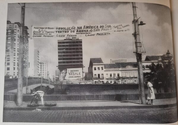 Um das imagens do livro, com a legenda: Faixa com anúncio da peça Revolução na América do Sul, de Augusto Boal, com o Teatro de Arena de São Paulo, montagem apresentada no Teatro de Santa Isabel, em 1960, com apoio da Prefeitura do Recife e do MCP